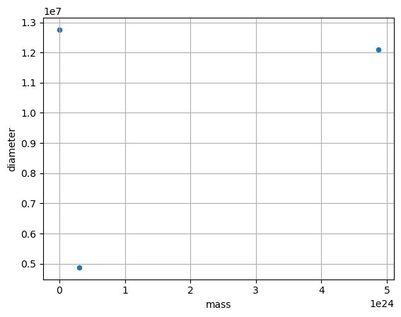 df.plot(kind='scatter', x='mass', y='diameter', grid=True)