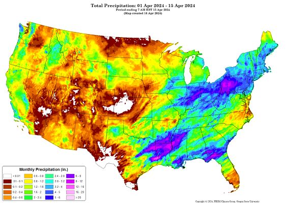Figure 1: Example of PRISM precipitation data for April, 2024 with 4 km resolution. Credit:PRISM Climate Group