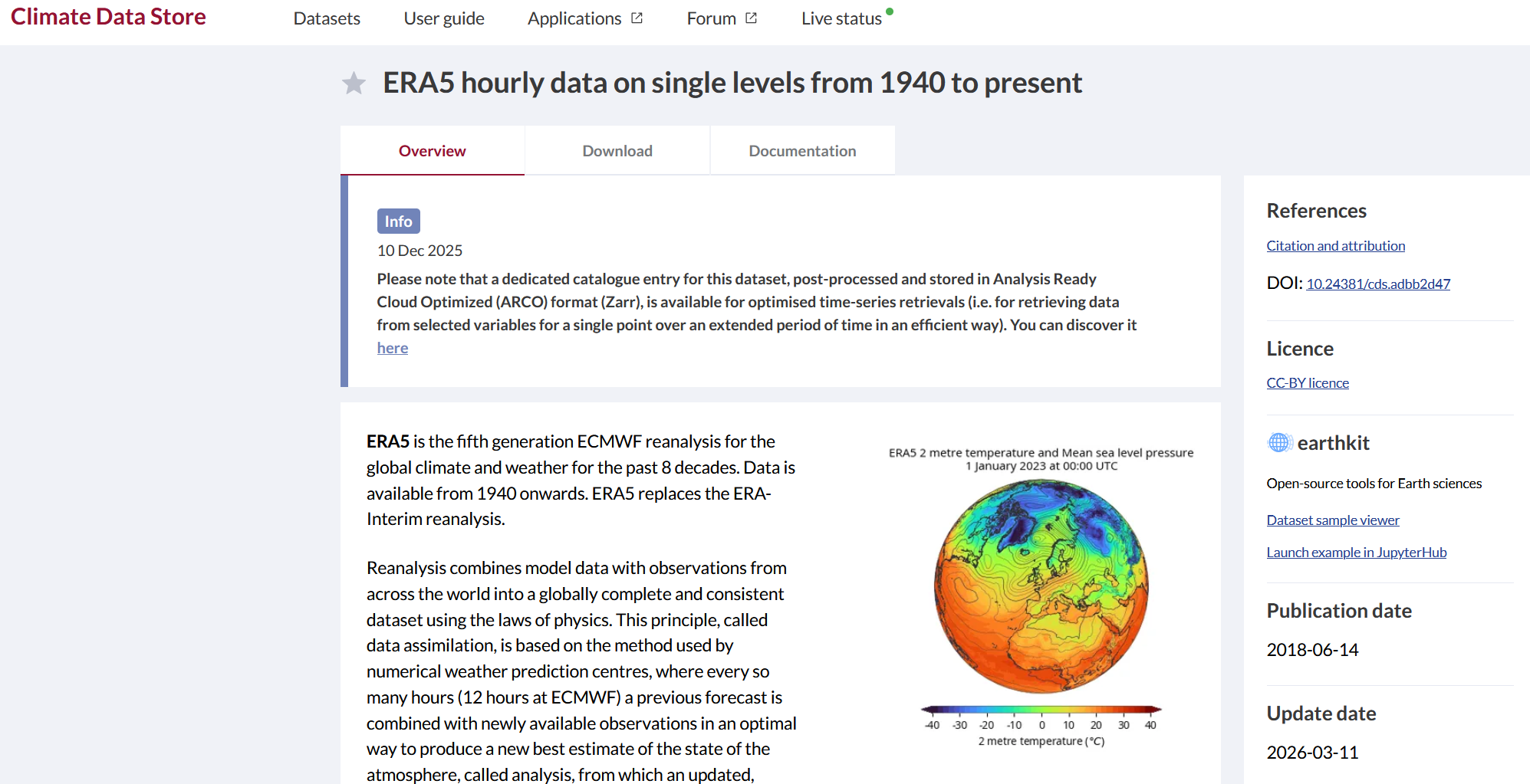 The European Reanalysis 5 (ERA5) is currently the most advanced and high resolution product. It covers the time period of 1940 to today at a resolution of 0.25 x 0.25 degrees and with hourly output